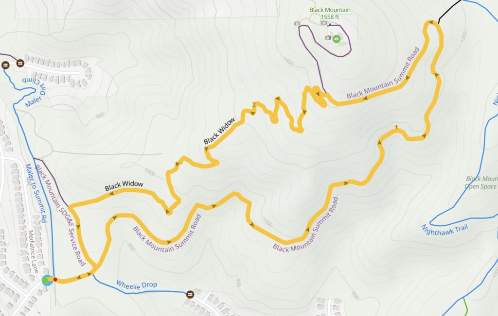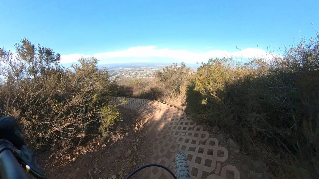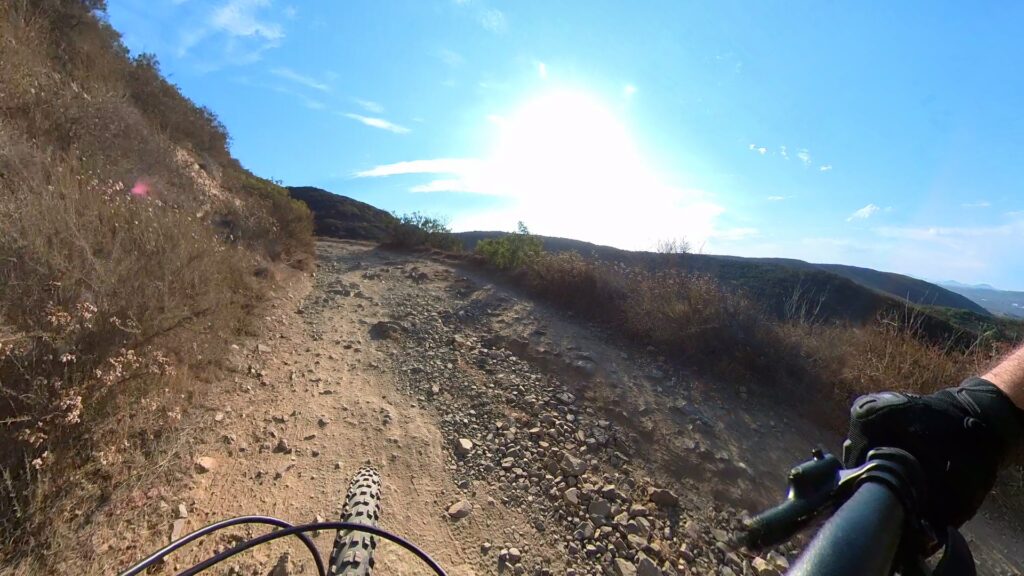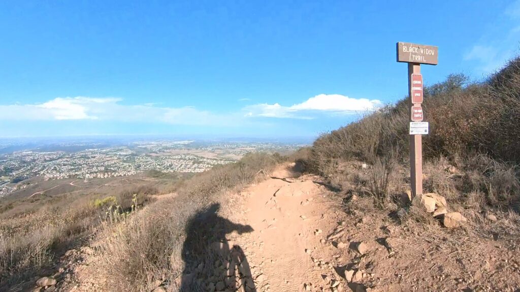 The Black Widow Trail at Black Mountain is a fun option if you’re looking for a short but exciting dirt trail with a mix of flowy sections and rocky terrain. Starting from the Black Mountain trailhead parking area, you first need to ride about 2 miles up the gravel service road. The path winds through chaparral-covered hillsides with a blend of rocky gravel and smoother dirt stretches. This paths ascends about 600 ft up, reaching the top of the mountain.